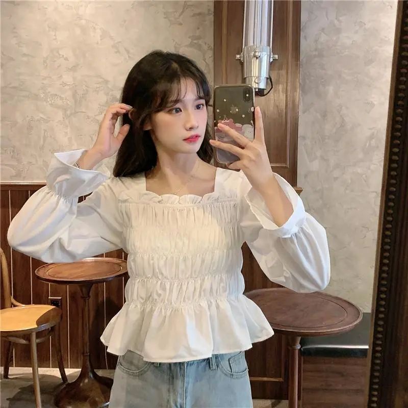 设计感小众长袖衬衫女2023早春新款韩版法式方口领皱褶白色衬衣女