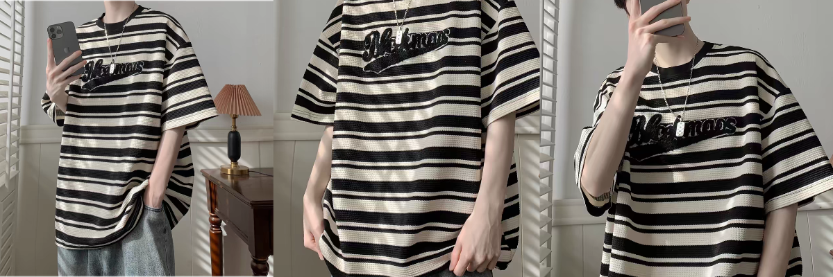 夏季港风复古圆领短袖t恤男潮流撞色休闲条纹宽松五分袖体恤上衣