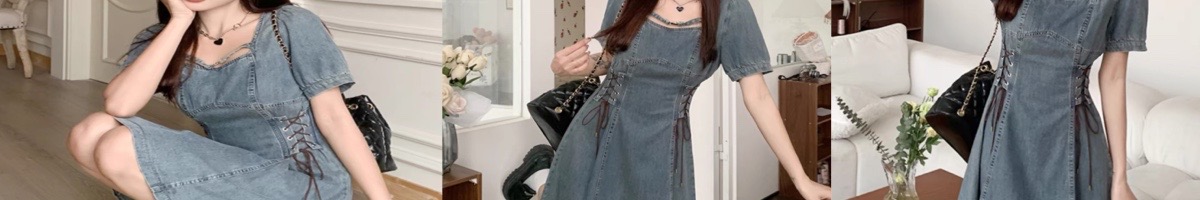 大码法式短袖连衣裙女夏季2024新款泡泡袖牛仔裙胖MM收腰显瘦裙子