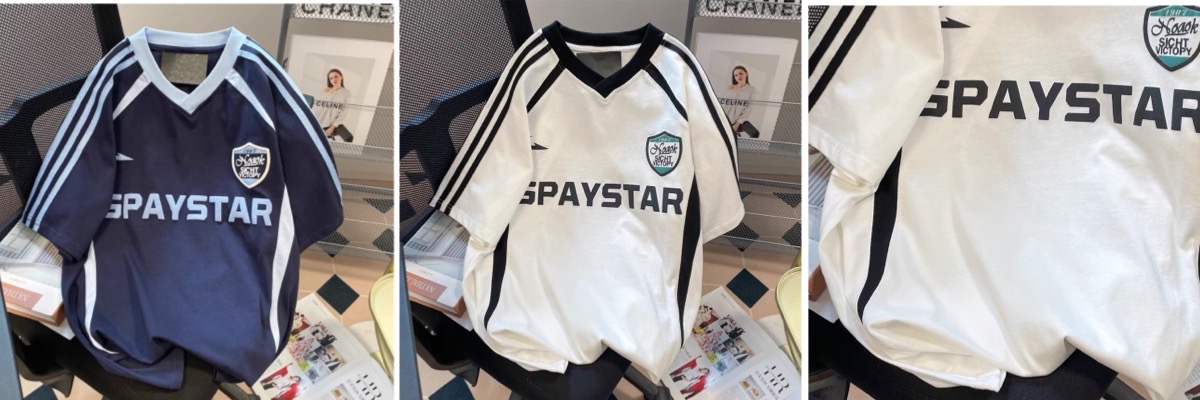 国潮美式街头拼色条纹v领t恤女夏情侣学院风复古运动休闲短袖上衣