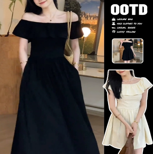 法式茶歇黑色一字肩连衣裙子女2024新款设计感小众赫本风收腰长裙