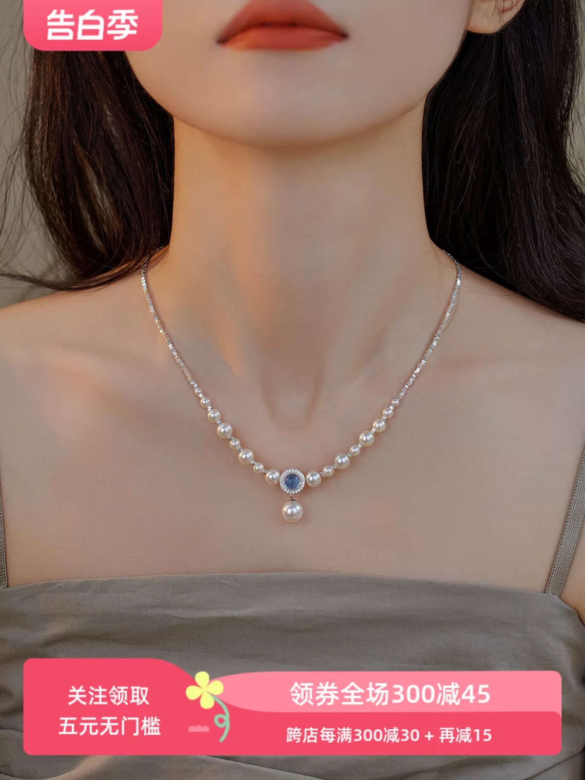 赛赛莉安海蓝宝珍珠S925纯银法式轻奢小众设计感项链简约气质百搭