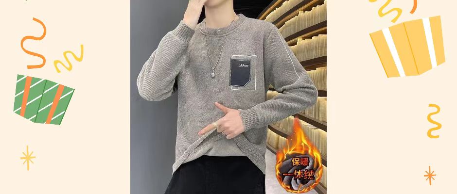 一体绒男士雪尼尔毛衣秋冬季潮牌圆领打底衫保暖上衣