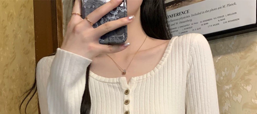春装2024新款洋气方领短款毛衣纽扣高级设计感针织衫内搭打底上衣