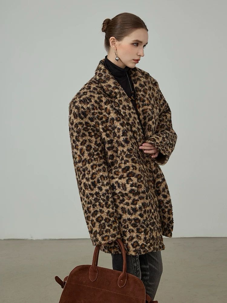 豹纹西装外套廓形2024新款显瘦酷帅百搭中长款冬季欧美风皮毛一体