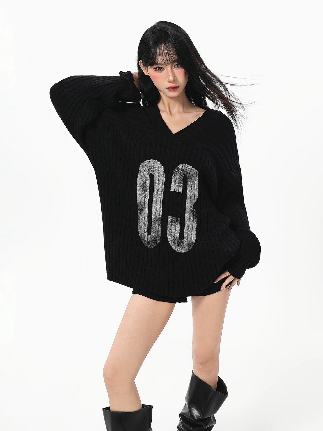 美式黑色v领针织毛衣女秋冬设计感慵懒风复古中长款外穿长袖上衣
