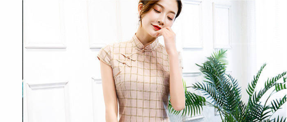 国民风旗袍短款格子旗袍女2020夏季新款修身淑女改良版复古连衣裙 藕粉