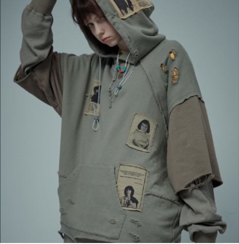 A SQUARE ROOT 华夫格袖拼接假两件复古贴布破坏毛圈厚款男女卫衣