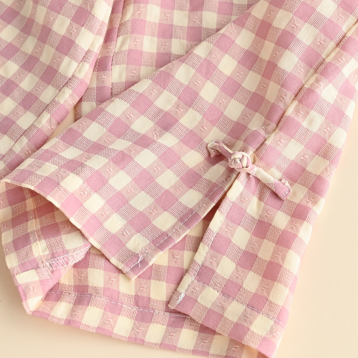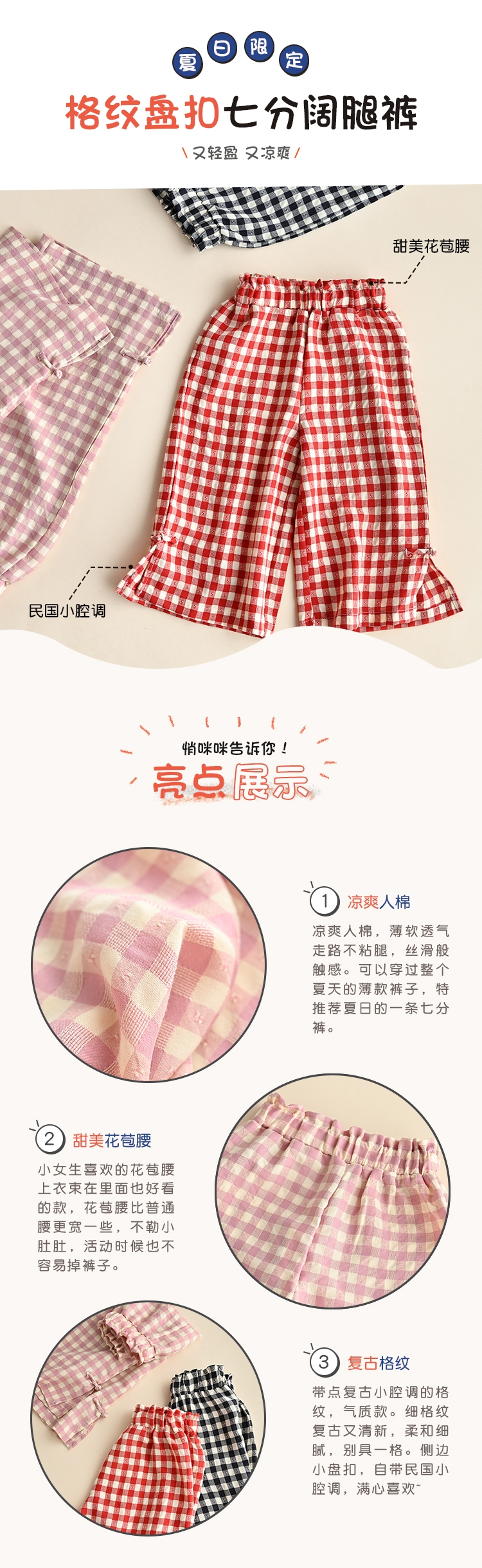 复古小格纹 轻盈凉快人棉 盘扣阔腿七分裤 女童夏季宽松休闲短裤